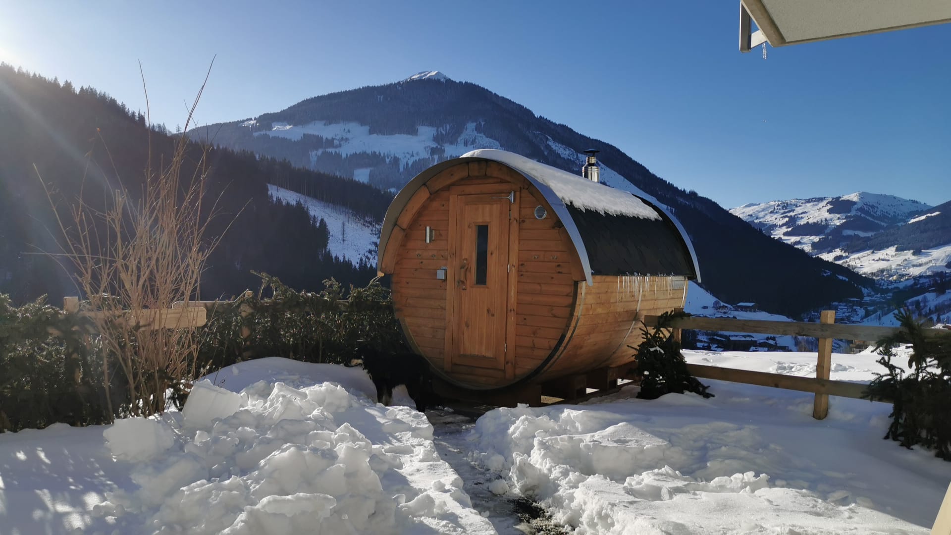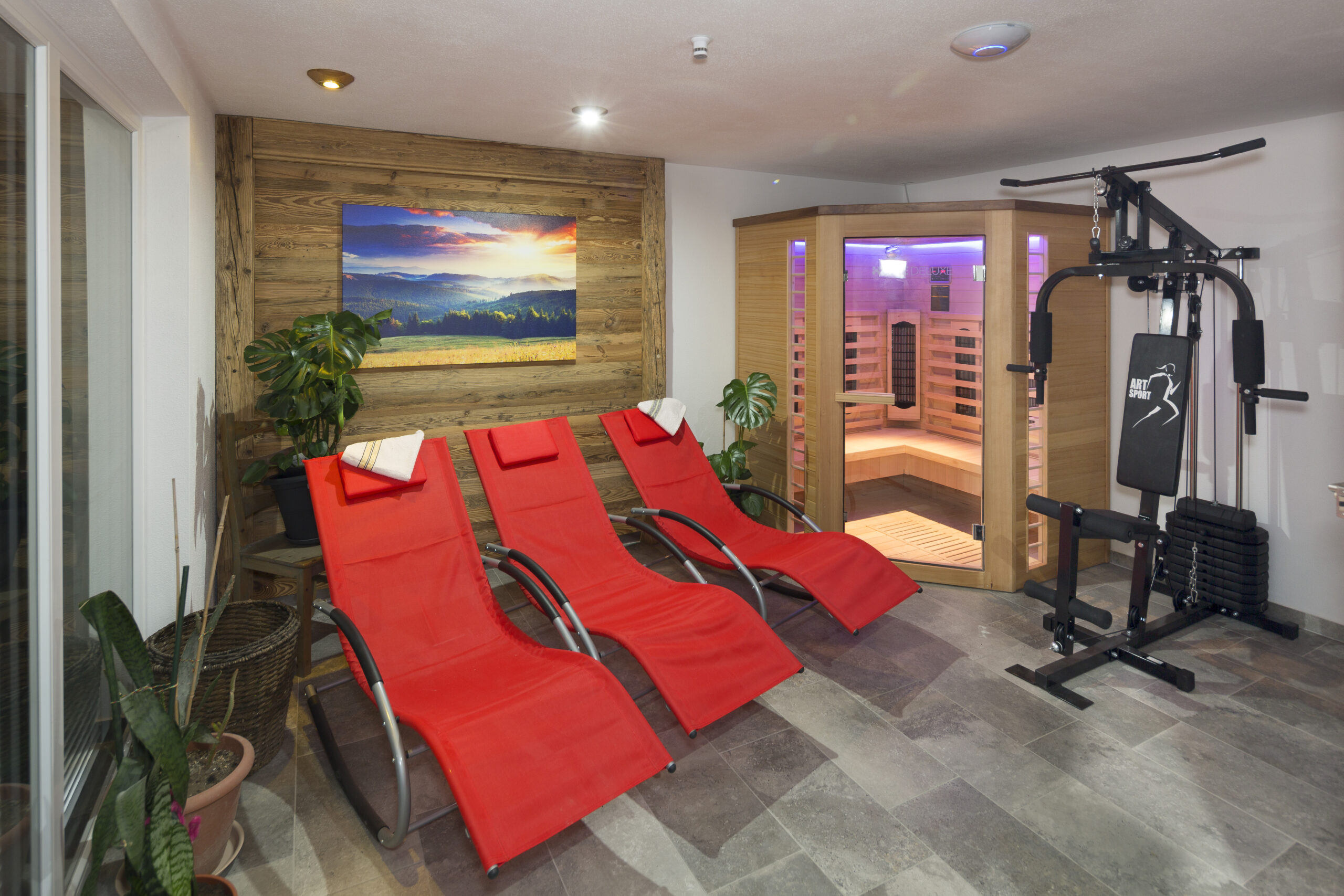 Wir bieten Ihnen einen Wellness- und Sauna-Bereich, der Sie auf eine Reise der Entspannung und Erholung entführt. Unsere Bioholz beheizte Panorama Fass-Sauna ist ein Highlight in unserem Wellness-Bereichs. Sie bietet einen atemberaubenden Blick auf Saalbach-Hinterglemm und sorgt für eine einzigartige Sauna-Erfahrung. Lassen Sie die Hitze auf sich wirken und genießen Sie die herrliche Aussicht. Eine moderne Infrarotkabine sorgt dafür das verspannte Muskel wieder locker werden. Für diejenigen, die sich gerne sportlich betätigen, haben wir Fitnessgeräte zur Verfügung, um Ihr Training zu optimieren. Der Innen Wellness-Ruhebereich ist ein Ort der Entspannung. Hier können Sie Ihre Sinne verwöhnen lassen und den Alltag hinter sich lassen. Ob Sie alleine mit Familie oder Freunden reisen, unser Haus bietet den perfekten Ort, um abzuschalten und neue Energie zu tanken. Entdecken Sie Ruhe und Natur und erleben Sie einen unvergesslichen Aufenthalt in unserem Haus.